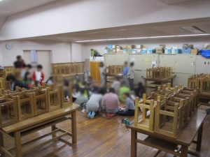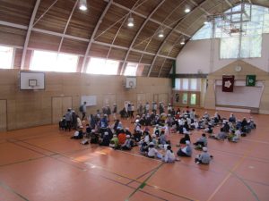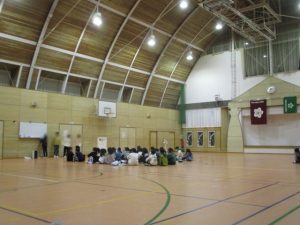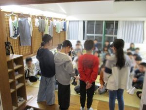 今朝は朝ごはんをしっかり食べた後は、体育室に集合です。