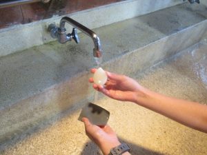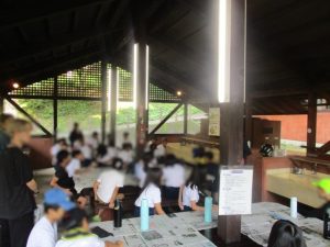 野外炊飯棟で、リーダーさんの説明通りに石を削っていきます。