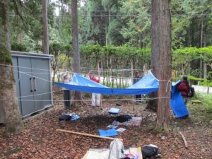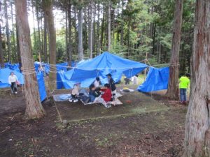 ロープ・木の棒・ブルーシートを使って思い思いの秘密基地を作ります。